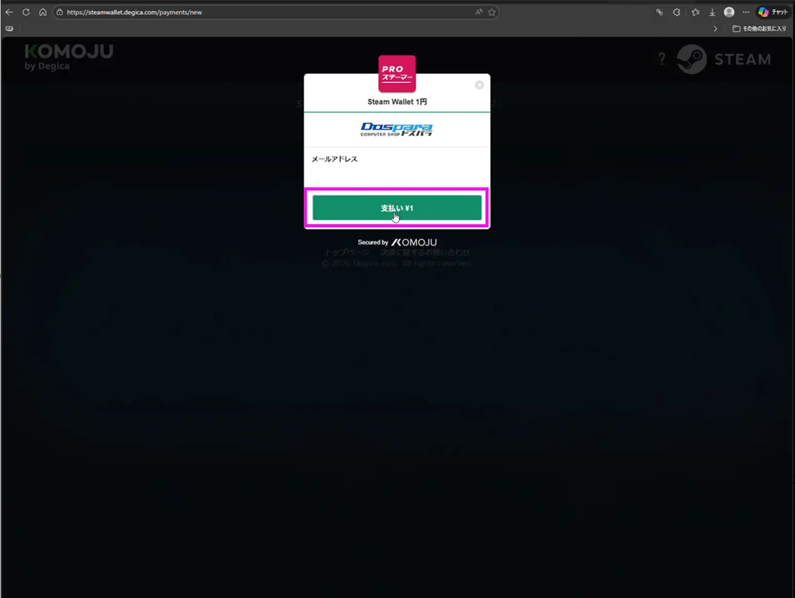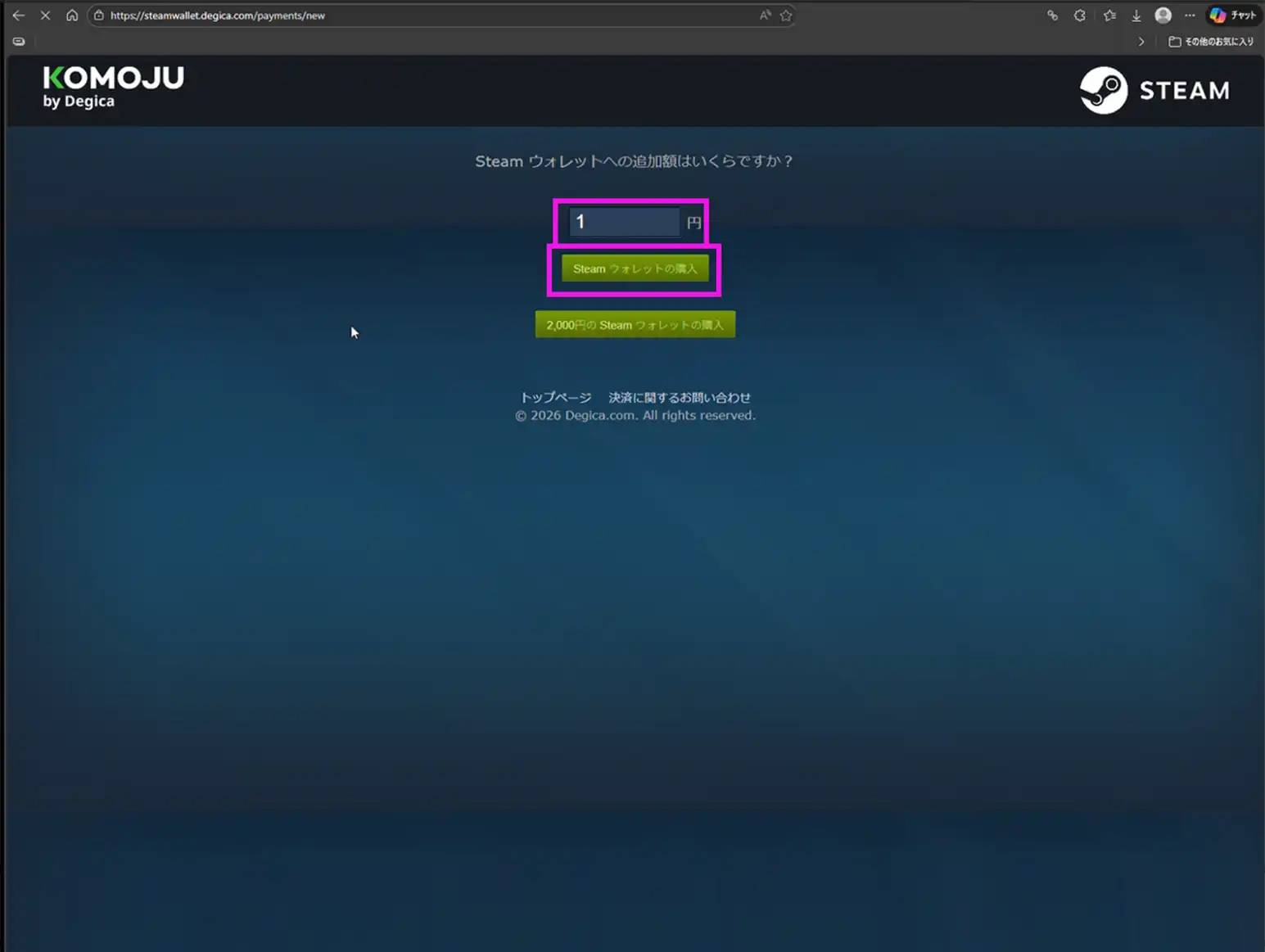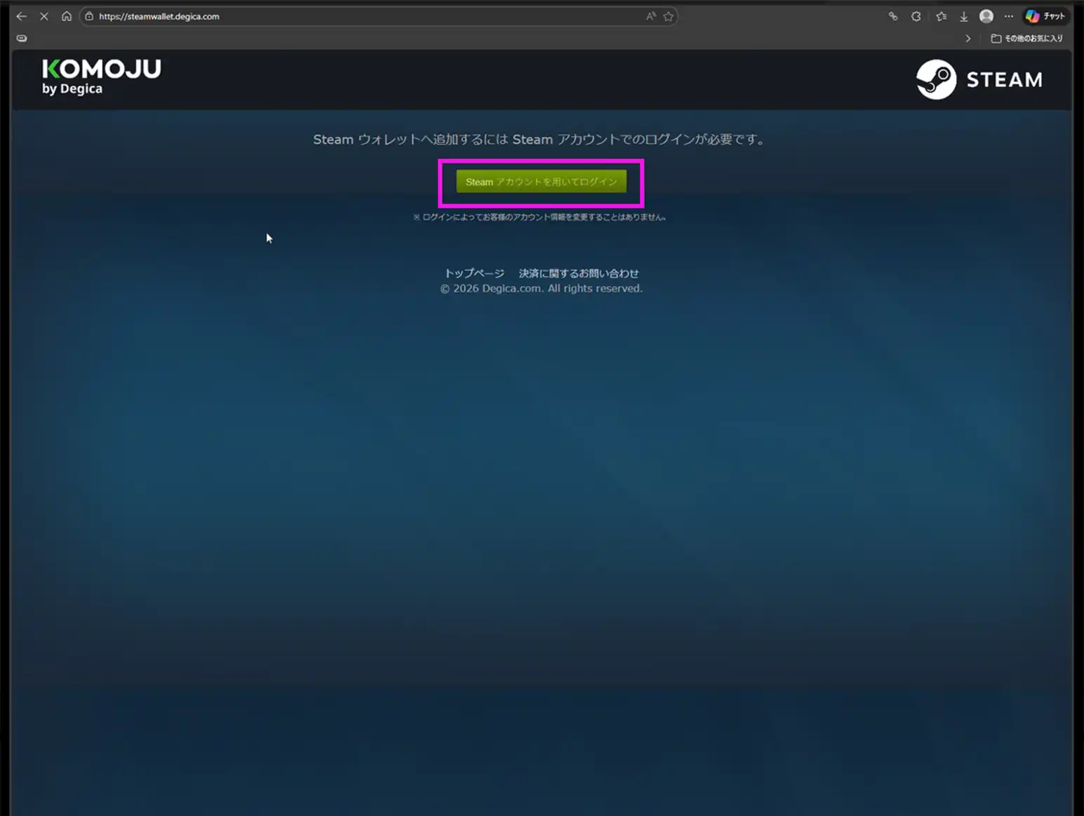 「Steamウォレットの購入」ボタンを押した際に