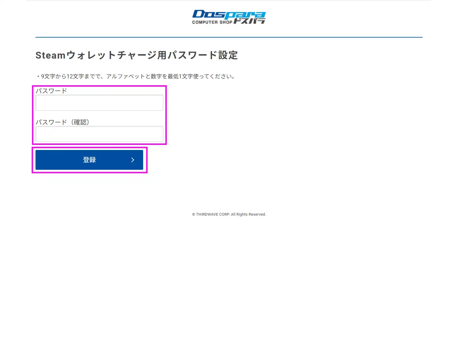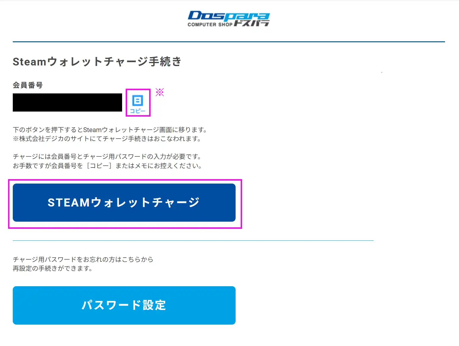 Steamチャージ用パスワードをご設定ください。こちらはドスパラ会員のパスワードとは異なります。
