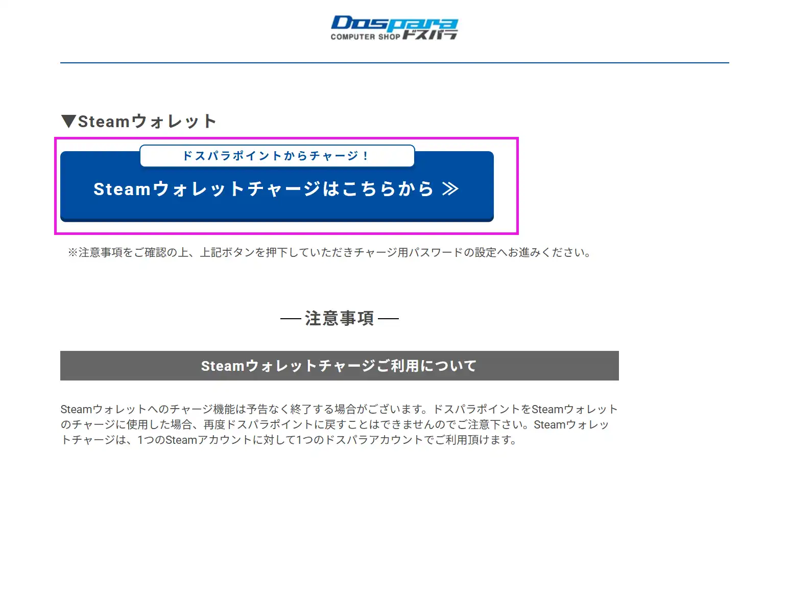 Steamウォレットへのチャージ機能は予告なく終了する場合がございます。ドスパラポイントをSteamウォレットのチャージに使用した場合、再度ドスパラポイントに戻すことはできませんのでご注意下さい。Steamウォレットチャージは、1つのSteamアカウントに対して1つのドスパラアカウントでご利用頂けます。