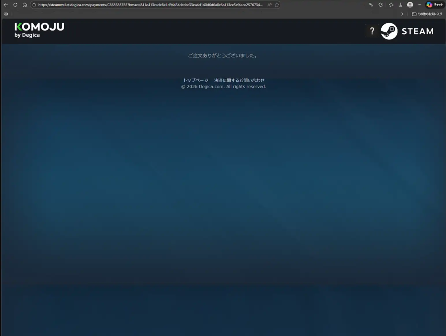 決済完了。 初回表示のメールアドレス及びSteamアカウントの履歴表示にて「キオスク」という決済名で金額が確認出来ます。