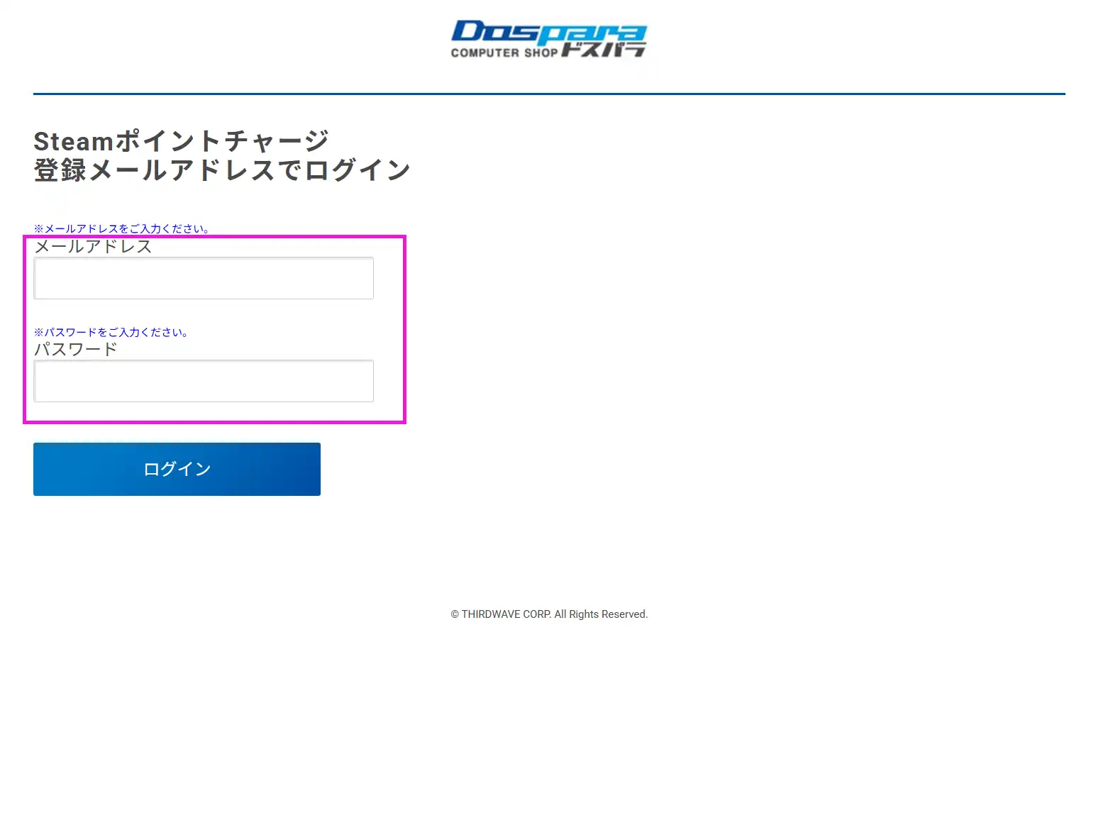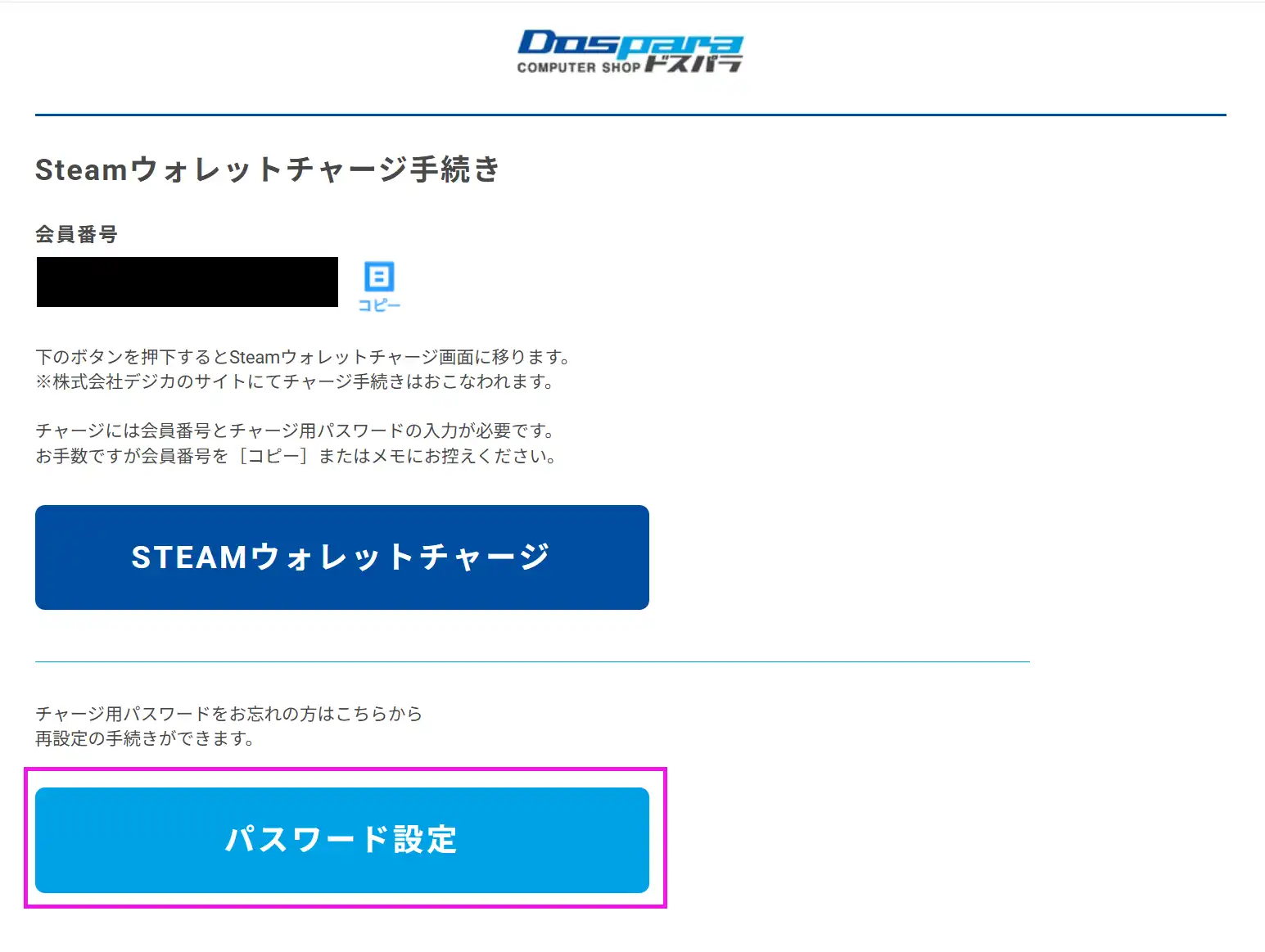 Web版Steamポイントチャージ画面にドスパラ会員情報でログインし、パスワード設定を行ってください。