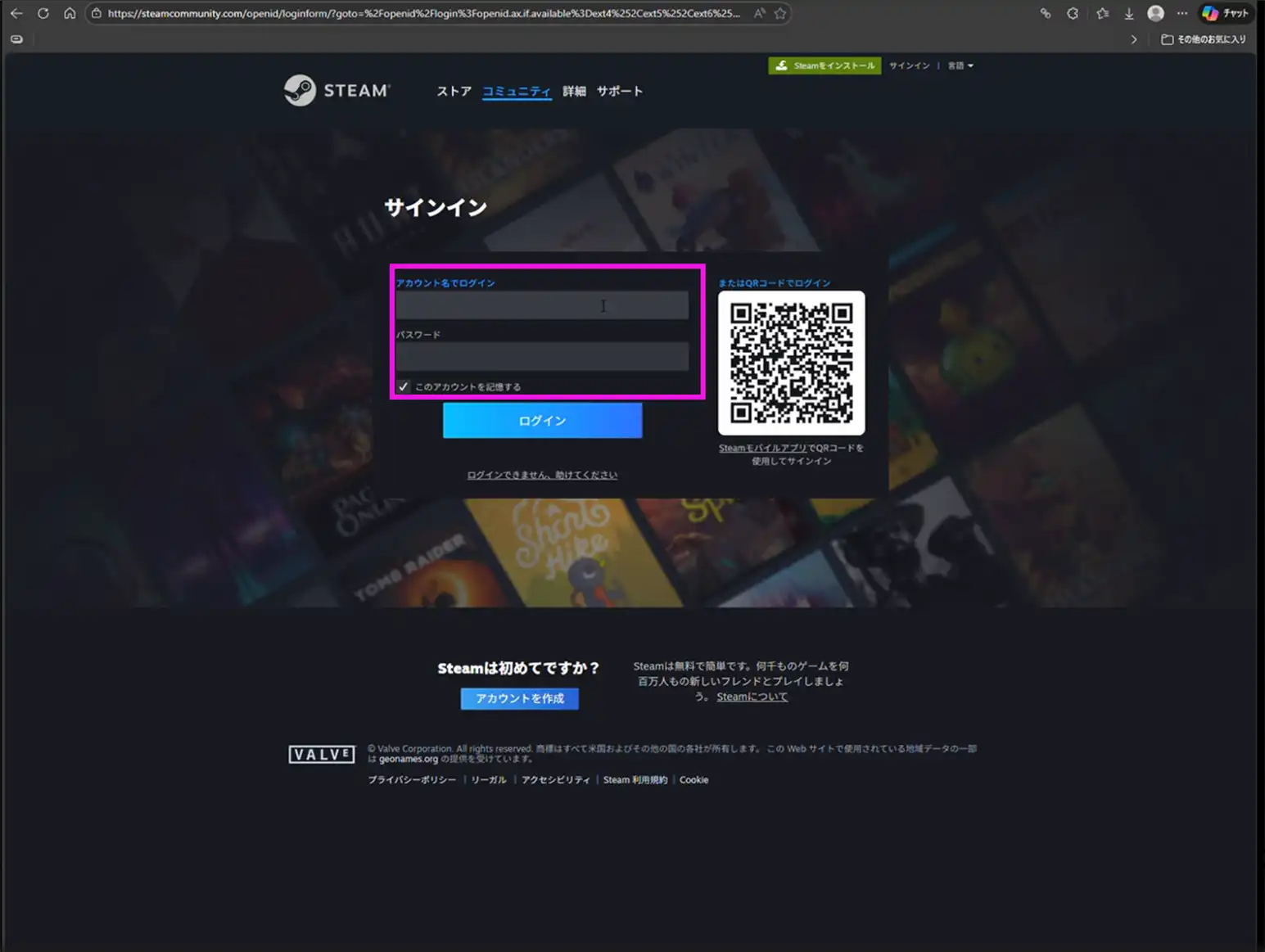 Steamアカウントのログインページへ。