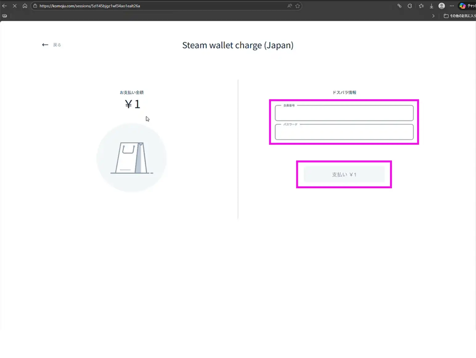 ドスパラの「会員番号」と先ほどステップ④で設定した「Steamチャージ用パスワード」を入力してください。入力が終わったらアクティブになった『支払い』ボタンをクリックしてください。