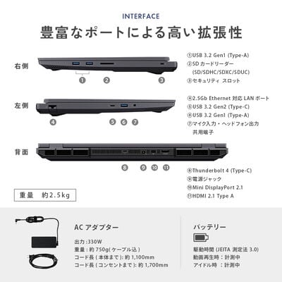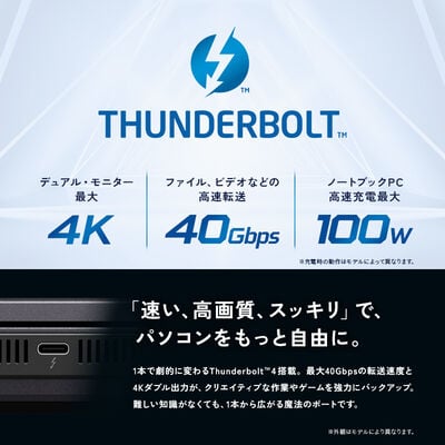 入出力ポートThunderbolt 4 (Type-C、映像出力 DisplayPort2.1 対応、PD対応/100W) x1