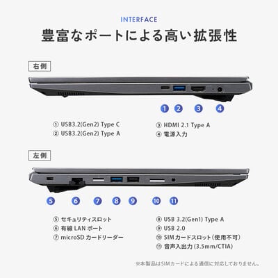 | 入出力ポート | USB3.2 Gen2 (Type-A) x1 USB3.2 Gen1 (Type-A) x1 USB3.2 Gen2 (Type-C、映像出力 DisplayPort1.4 対応、PD対応) x1 USB2.0 (Type-A) x1 HDMI 2.1 Type A x1 マイク入力・ヘッドフォン出力 共用端子 (3.5mm 4極 CTIA) |