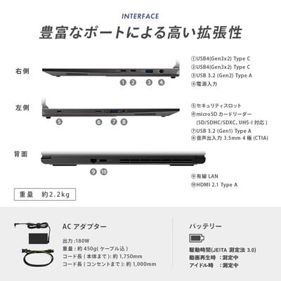 | 入出力ポート | USB4 Gen3x2 (Type-C、映像出力 DisplayPort2.1 対応、PD対応/100W) x1 USB4 Gen3x2 (Type-C、映像出力 DisplayPort2.1 対応、PD非対応) x1 USB3.2 Gen2 (Type-A) x1 USB3.2 Gen1 (Type-A) x1 HDMI 2.1 Type A x1 マイク入力・ヘッドフォン出力 共用端子 (3.5mm 4極 CTIA) |