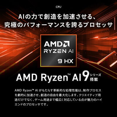 | CPU | AMD Ryzen AI 9 HX 470 (最大5.2GHz/12コア/24スレッド) |