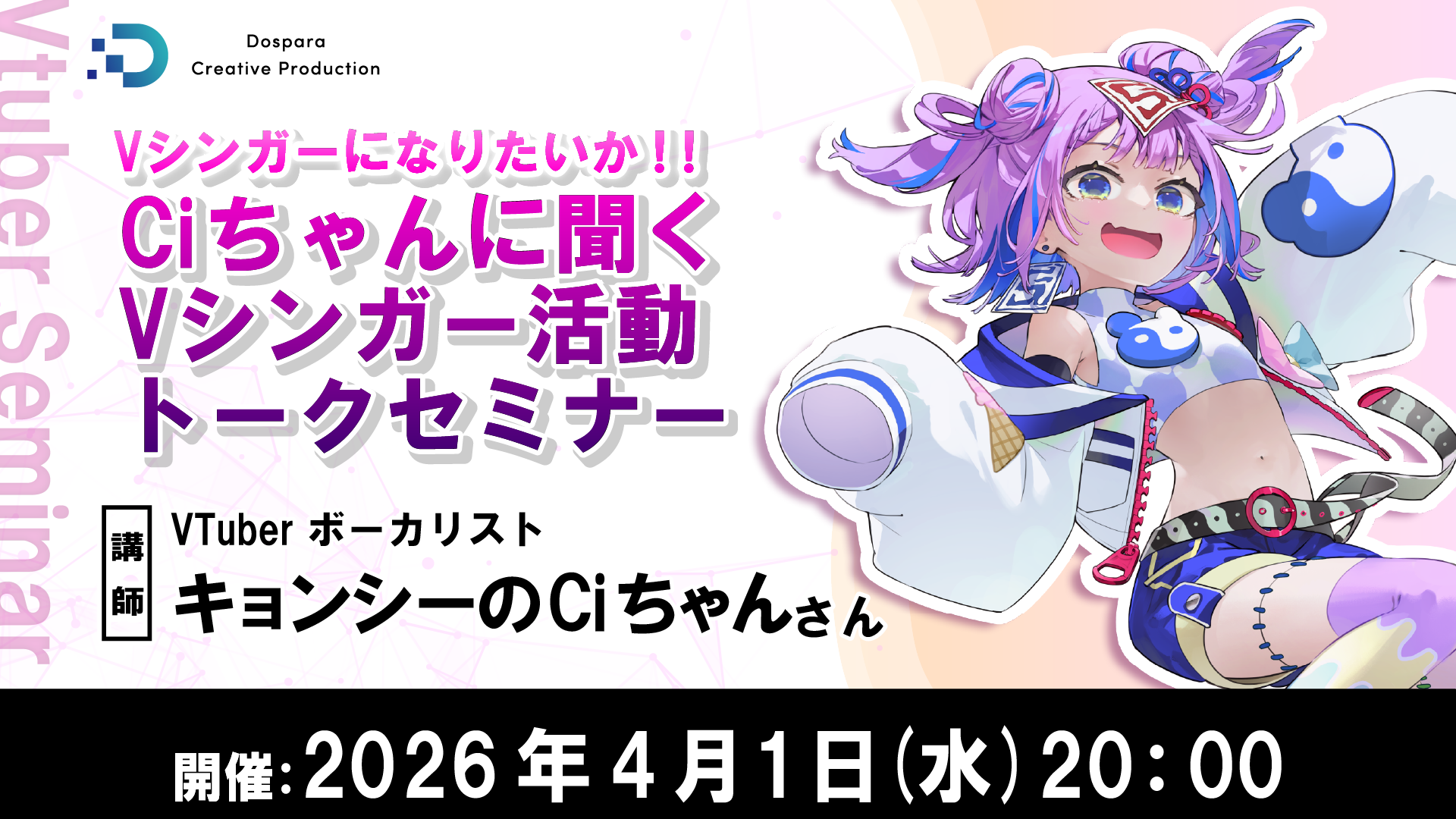 本セミナーでは、VシンガーであるキョンシーのCiちゃんさんが、自身の経験をもとに活動に対する考え方や投稿戦略、楽曲選びの視点、そしてこれまで直面してきた悩みとその乗り越え方について語ります。