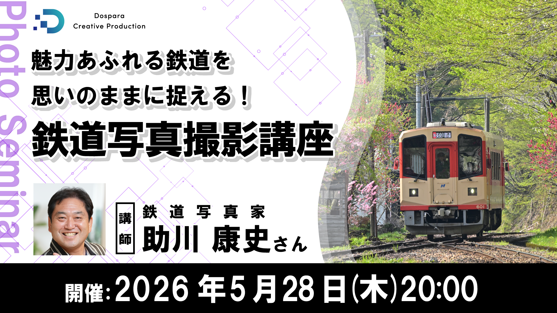 講師は、鉄道写真家・プロカメラマンの助川康史さん。鉄道写真初心者はもちろん、ベテランもワンランク上の鉄道写真を目指すための基本が学べます。